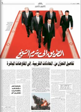 據(jù)英國廣播公司(BBC)9月16日?qǐng)?bào)道,埃及全國發(fā)行量最大的《金字塔報(bào)》9月14日曾以《通往沙姆沙伊赫之路》為題,公布了一張中東和談?lì)I(lǐng)導(dǎo)人的照片。不為人知的是,這張照片是經(jīng)過修改的,將埃及總統(tǒng)穆巴拉克的位置由最右邊移至最前方,顯示出穆巴拉克走在所有領(lǐng)導(dǎo)人的最前面,暗示埃及才是和談的主導(dǎo)力量。