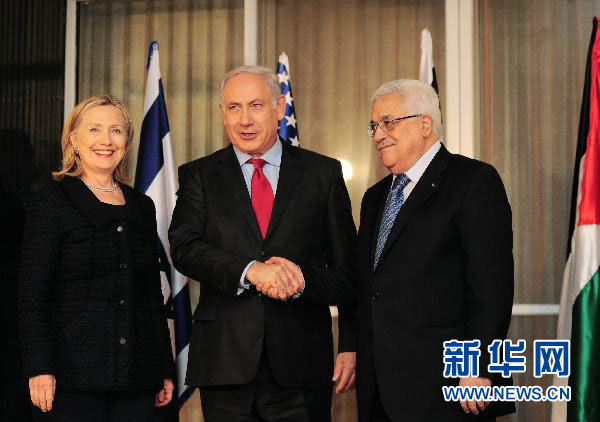 2010年9月15日,以色列總理內(nèi)塔尼亞胡(中)在耶路撒冷總理官邸與美國國務(wù)卿希拉里·克林頓(左)、巴勒斯坦民族權(quán)力機(jī)構(gòu)主席阿巴斯(右)會(huì)面。當(dāng)日,巴勒斯坦和以色列領(lǐng)導(dǎo)人在耶路撒冷繼續(xù)舉行雙方第二輪直接和談,美國國務(wù)卿希拉里參加談判。(新華社記者尹棟遜攝)