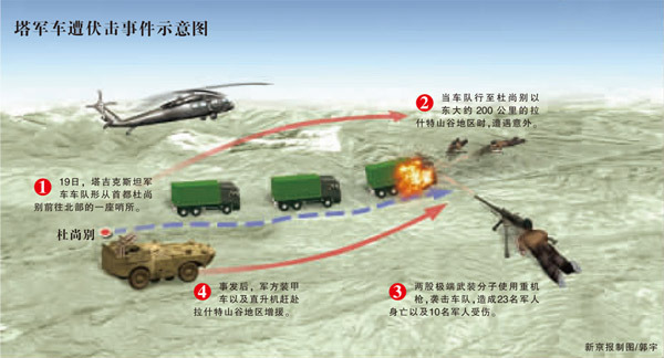 塔吉克斯坦官員20日表示,一批被雇傭的伊斯蘭極端武裝分子在該國(guó)境內(nèi)與阿富汗交界地區(qū)伏擊了軍車,導(dǎo)致至少23名軍人身亡。