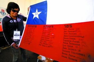 24日,一位被困礦工的母親展示有33名被困礦工簽名的智利國旗。