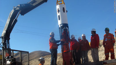 當(dāng)救援通道完全打通后,工作人員將把這種救生艙放入井下,救生艙大概有一人大小,可以將井下礦工一個接一個的運送出洞。智利政府表示,如果進展順利,他們可能將于11月初或者更早被救出。