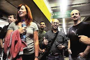 乘客興高采烈地走出機(jī)場(chǎng)。
