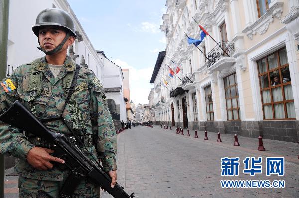 10月1日,在厄瓜多爾首都基多,士兵在總統(tǒng)府附近警戒。新華社發(fā)(圣地亞哥·阿馬斯攝)