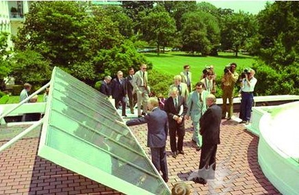 資料圖:卡特1979年曾在白宮屋頂舉行發(fā)布會,展示上面安裝的32塊電池板,希望借此傳達美國要擺脫對進口石油的依賴,但一直到現(xiàn)在美國人都沒有擺脫對進口石油的依賴。1986年白宮屋頂翻修,這些電池板被移走。后來被安裝在一所學校里,用來給學生食堂燒水。