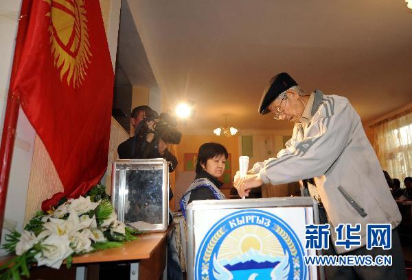 2010年10月10日,在吉爾吉斯斯坦首都比什凱克一個投票站,一名老人參加議會選舉投票。新華社記者沙達(dá)提攝