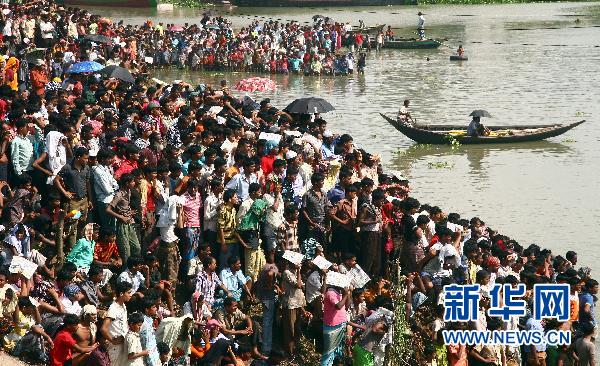10月11日,數(shù)千名當(dāng)?shù)厝罕娫诿霞永瓏?guó)首都達(dá)卡郊外薩瓦爾鎮(zhèn)的客車墜河事故現(xiàn)場(chǎng)等待救援結(jié)果。新華社發(fā)(沙立夫爾·伊斯蘭姆攝)