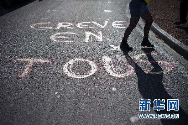10月13日,在法國謝納,一女子走過寫有“人人都來參加罷工”的路面。新華社/法新