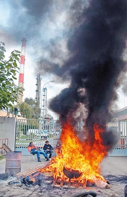 法國當(dāng)局下令煉油廠工人復(fù)工,但工人在煉油廠要道燒輪胎。