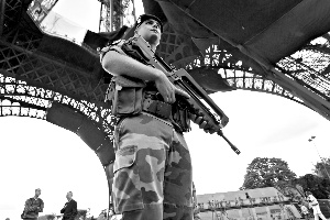 上月,安全部隊士兵在埃菲爾鐵塔巡查。