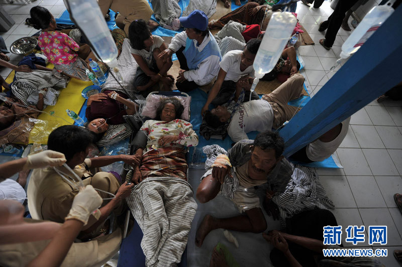 10月28日,在印度尼西亞西蘇門答臘省明打威群島的北巴蓋島一個小村莊,在海嘯中受傷的村民接受醫(yī)護人員治療。