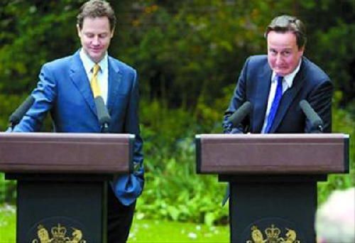 克萊格(左)和卡梅倫在英國首相府首次舉行聯(lián)合新聞發(fā)布會的情景(資料圖片)