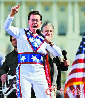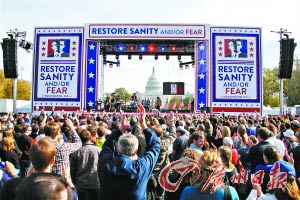 大批美國民眾10月30日聚集在首都華盛頓,參加知名電視喜劇節(jié)目主持人喬恩·斯圖爾特和斯蒂芬·科爾伯特組織的集會活動。兩人在集會上呼吁民眾恢復(fù)“理智”,不要被激烈的選戰(zhàn)、部分政客和媒體的煽動性言論沖昏頭腦。