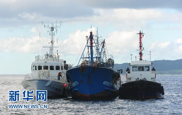 資料圖片:2010年9月12日,日本海上保安廳的兩艘巡邏船將中國漁船夾在中間。當(dāng)天,日本海上保安廳將中國漁船拖到?jīng)_繩縣石垣港附近海域進(jìn)行了模擬海上作業(yè)檢查。 新華社記者 季春鵬 攝