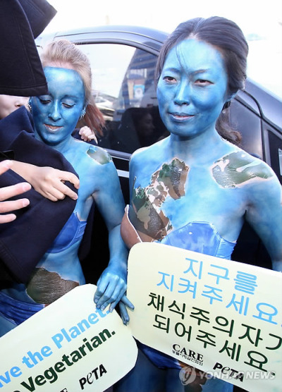 據(jù)稱(chēng),9日下午,“從倫理的角度對(duì)待動(dòng)物的團(tuán)體”成員加拿大人F某(24歲、女)和“愛(ài)護(hù)動(dòng)物實(shí)踐協(xié)會(huì)”成員韓某(34歲、女)幾乎赤裸著身體在COEX附近舉行游行示威,呼吁人們只吃素食,不要吃肉。