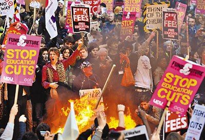 據(jù)香港《文匯報(bào)》12日報(bào)道,英國10日爆發(fā)首場反對財(cái)政緊縮措施的暴力示威,5萬名學(xué)生在首都倫敦上街抗議,反對政府削減教育開支,并大幅上調(diào)每年學(xué)費(fèi)至9000英鎊(約合9.6萬元人民幣),是現(xiàn)水平的3倍。后來,示威演變成暴力沖突,部分人沖進(jìn)保守黨總部大樓,破壞接待處和大堂,有人從天臺投擲雜物。事件中有14人受傷,32人被捕。首相卡梅倫譴責(zé)了此次事件,稱不能接受暴力行為。