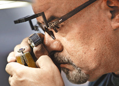 珠寶工人在打造翻版藍(lán)寶石訂婚鉆戒。