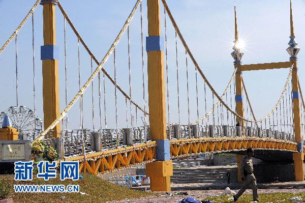 11月24日,在柬埔寨金邊市,一名警察從發(fā)生踩踏慘案的鉆石島橋邊走過。柬埔寨國家警察副總監(jiān)和金邊踩踏事故調(diào)查特別委員會副主席索帕當(dāng)天說,22日發(fā)生的鉆石島橋踩踏慘案是因橋身晃動引起恐慌造成的。新華社/法新