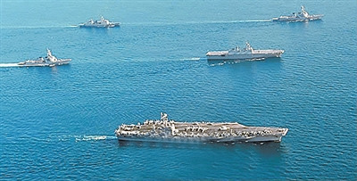 此次演習(xí)中,美軍不僅派出搭載著超過6000名士兵和75架戰(zhàn)機(jī)的“喬治·華盛頓”號核動(dòng)力航母,還出動(dòng)9600噸級的“考彭斯”號導(dǎo)彈巡洋艦和9750噸級的“斯特蒂姆”號導(dǎo)彈驅(qū)逐艦。韓國方面也投入7600噸級“世宗大王”號宙斯盾級驅(qū)逐艦、兩艘4500噸級驅(qū)逐艦以及巡邏艦、護(hù)航艦、戰(zhàn)斗支援艦和反潛飛機(jī)等。