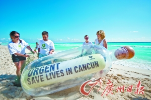 慈善組織在坎昆海灘放出一個(gè)巨大的漂流瓶,上面寫著“十萬(wàn)火急,在坎昆挽救生命”。