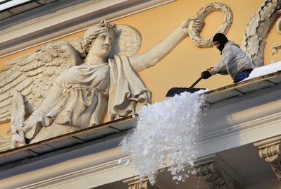 俄羅斯工人清掃劇院屋頂積雪