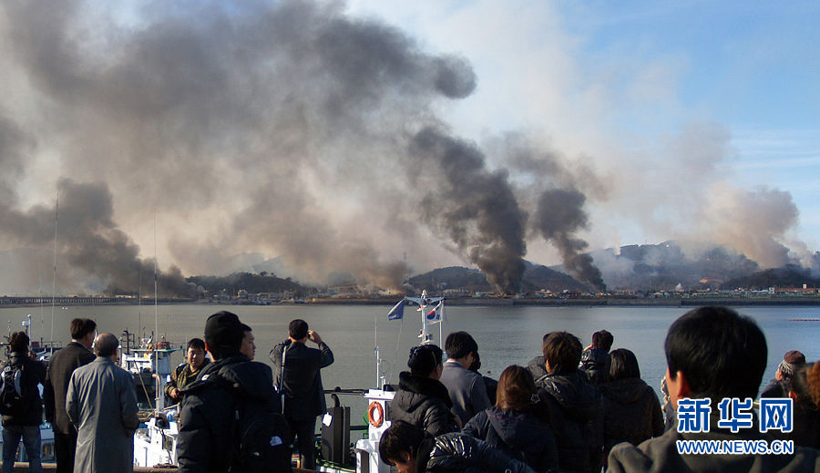 11月23日,人們觀望韓國西部延坪島上的滾滾硝煙。新華社/路透