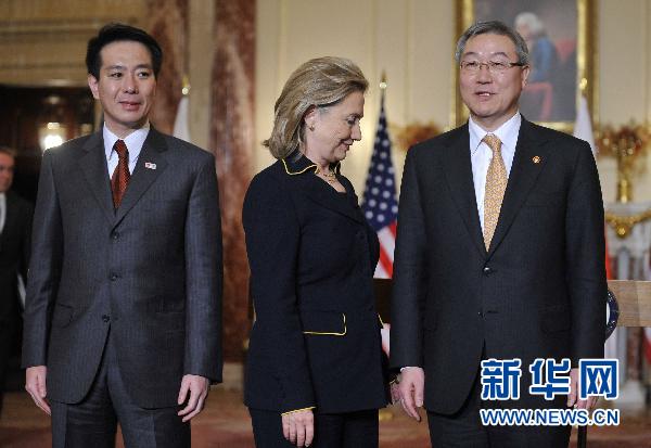 12月6日,在美國首都華盛頓國務(wù)院,美國國務(wù)卿希拉里·克林頓(中)、韓國外交通商部長官金星煥(右)和日本外務(wù)大臣前原誠司在舉行三邊會晤后共同會見記者。新華社記者張軍攝