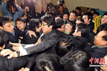 在韓國(guó)議會(huì),這類激烈沖突已經(jīng)屢見不鮮。遇到自己強(qiáng)烈反對(duì)的議案或者提議時(shí),議員們通常會(huì)用“武力”表達(dá)自己的不滿。嚴(yán)重時(shí),議員利用桌椅、滅火器群毆,甚至有人被打掉牙。