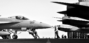 6日,日美聯(lián)合軍演中,美軍士兵正移動航母上的一架大黃蜂戰(zhàn)機。當(dāng)天,兩架俄巡邏機橫穿軍演空域。