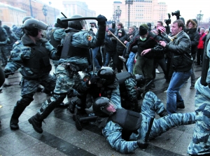 11日,莫斯科市中心馬涅什廣場(chǎng),集會(huì)球迷與防暴警察發(fā)生沖突。