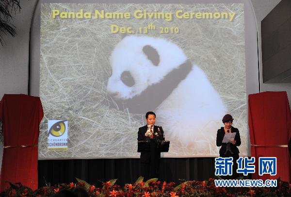 奧地利出生熊貓寶寶得名“;ⅰ 12月13日,在奧地利首都維也納的美泉宮動物園,中國野生動物保護協(xié)會秘書長臧春林(中)在命名儀式上致辭。當日,美泉宮動物園舉辦熊貓寶寶命名儀式,正式公布今年8月23日在這個動物園出生的雄性大熊貓幼仔得名“;ⅰ。;⑹窃诿廊獙m動物園出生的第二只大熊貓,它的父母龍徽和陽陽曾于2007年8月產(chǎn)下一只名為福龍的熊貓幼仔。福龍深受奧地利人民的喜愛,而“;ⅰ边@個名字既有祝福的寓意,又和它兄長的名字相應,是奧地利網(wǎng)民從“;ⅰ、“奧康”、“維興”三個名字中票選出來的。新華社記者徐亮攝