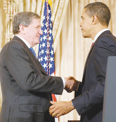 圖為霍爾布魯克(右)2009年1月22日在白宮與剛就任美國總統(tǒng)的奧巴馬握手。新華社/法新
