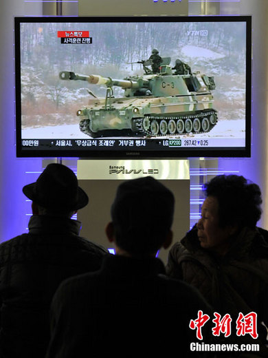 12月20日,韓國(guó)軍方開始在延坪島舉行海上實(shí)彈射擊訓(xùn)練。圖為韓國(guó)民眾在電視上收看演習(xí)訓(xùn)練的新聞。