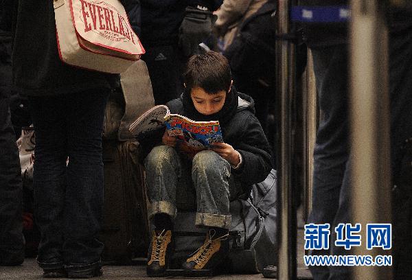 2010年12月21日 大雪“致癱”歐洲交通 12月21日,在英國倫敦圣潘克勒斯車站,一名小旅客在排隊(duì)等待搭乘“歐洲之星”高鐵時(shí)看漫畫書。受近日強(qiáng)降雪影響,歐洲多個(gè)交通樞紐癱瘓。作為歐洲和美洲大陸間重要航空中轉(zhuǎn)站的倫敦希思羅機(jī)場滯留旅客近萬名。 新華社/法新