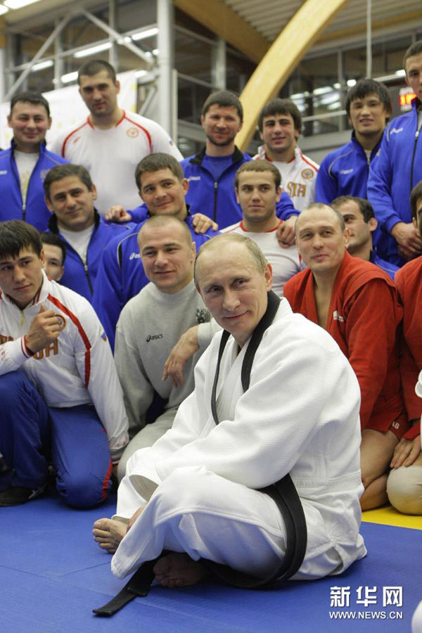12月22日,俄羅斯總理普京(前)在俄羅斯圣彼得堡市的一家體育俱樂部和柔道運動員們坐在一起。新華社/法新