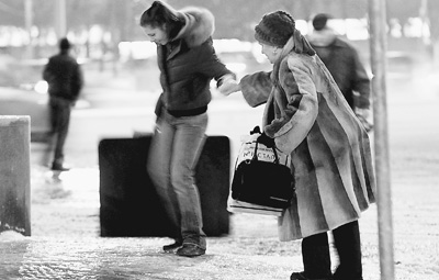 圖為莫斯科街頭的行人在結(jié)冰的路面上相互攙扶著行走。人民圖片