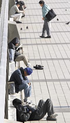 失業(yè)曬太陽幾個(gè)東京人28日在一處行人天橋上無所事事曬太陽。日本政經(jīng)局勢(shì)今年發(fā)生許多變化,可能就此從一等強(qiáng)國淪為二等強(qiáng)權(quán)地位。