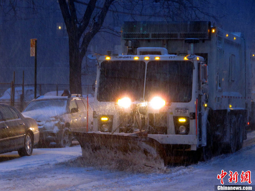 一場暴風雪26日撲向美國東北部的新澤西州、紐約市等地,同時伴有時速達到四五十哩的勁風,預(yù)計26日及27日為這些地區(qū)帶來十英寸左右的積雪。公路行車危險大增,卷起的漫天白雪可能造成航班嚴重誤點,導致華盛頓、紐約和波士頓機場近日取消航班。圖為紐約法拉盛街頭掃雪車正在清理公路積雪。中新社記者 孫宇挺 攝