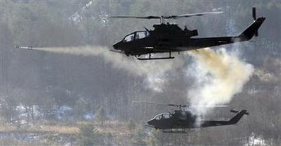 1月6日,韓國一架AH-1S眼鏡蛇直升機在延坪島進行實彈射擊演練。