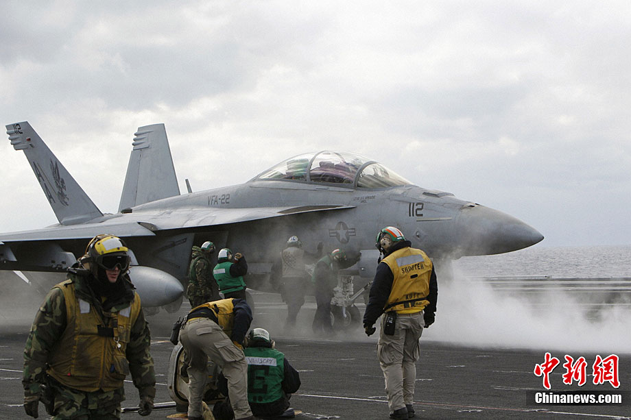 美國海軍的“卡爾·文森”號航母戰(zhàn)斗群與日本海上自衛(wèi)隊“鞍馬”號驅逐艦9日至10日在日本長崎縣附近海域舉行聯(lián)合演習。此次演習,內容包括通訊演練和艦載直升機在對方軍艦上起降等。圖為F/A18超級大黃蜂在航母上起飛。