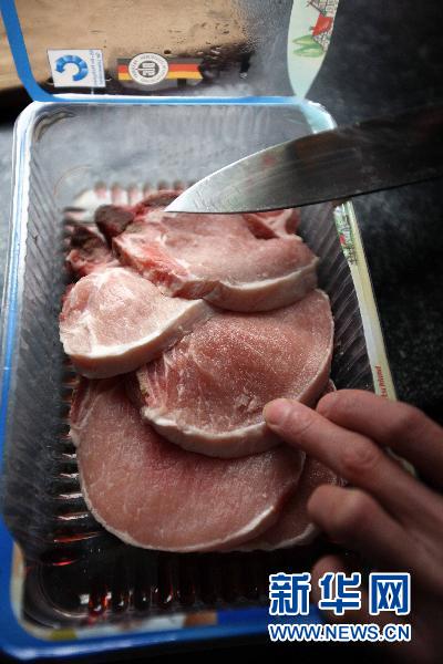 1月11日,一名廚師在德國(guó)首都柏林展示他剛從超市買(mǎi)回來(lái)的豬肉。德國(guó)下薩克森州農(nóng)業(yè)部發(fā)言人當(dāng)日說(shuō),該州一養(yǎng)豬場(chǎng)的豬肉樣本被檢測(cè)出二惡英含量明顯超標(biāo)。這是近日爆發(fā)的德國(guó)“二惡英毒飼料”事件中首次發(fā)現(xiàn)豬肉被二惡英污染。新華社記者 羅歡歡 攝