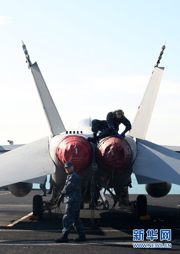 1月11日,在韓國釜山,士兵在“卡爾·文森”號航母上工作。當(dāng)日,美國海軍核動力航空母艦“卡爾·文森”號抵達(dá)韓國海軍作戰(zhàn)司令部釜山基地。 新華社發(fā)(樸真熙 攝)