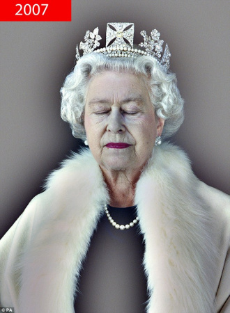 1998年的畫像最特別,女王的頭部懸在身體上。