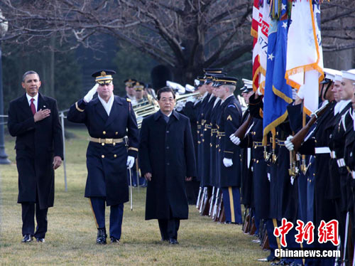 中國國家主席胡錦濤當(dāng)?shù)貢r間19日上午來到白宮南草坪,出席美國總統(tǒng)奧巴馬為他舉行的隆重歡迎儀式。圖為胡錦濤在奧巴馬陪同下檢閱儀仗隊。張朔 攝
