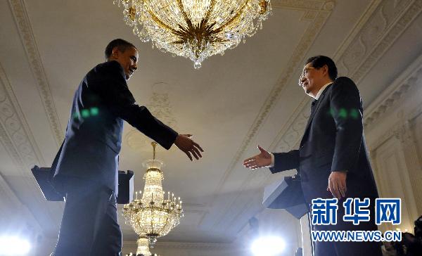 1月19日,中國國家主席胡錦濤同美國總統(tǒng)奧巴馬在白宮共同會見記者。 新華社記者 張軍 攝