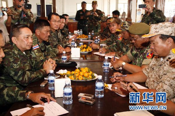 2月5日,柬泰兩國高級(jí)指揮官在柬埔寨奧多棉吉省安隆汶邊境口岸柬方一側(cè)舉行會(huì)談。會(huì)談后雙方表示已就避免再次發(fā)生武裝沖突達(dá)成一致。柬埔寨王家軍第四軍區(qū)司令謝蒙(右一)和泰國皇家軍泰國第二軍軍長塔瓦猜(左一)參加了當(dāng)天的會(huì)談。經(jīng)過90分鐘的會(huì)談,雙方達(dá)成了3項(xiàng)共識(shí):停止在兩國邊境容易引起爭議的地方修筑道路;推動(dòng)兩國聯(lián)合邊界委員會(huì)盡快進(jìn)行勘界工作;雙方不再調(diào)動(dòng)軍隊(duì)并不再發(fā)生武裝沖突。新華社發(fā)(索萬納拉攝)