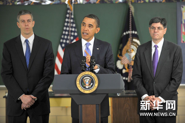 2月14日,美國總統(tǒng)奧巴馬(中)在美國馬里蘭州的一所中學(xué)發(fā)表演講。奧巴馬在演講時(shí)稱,民主黨和共和黨需要共同努力來減少赤字,當(dāng)日白宮提出的2012財(cái)年預(yù)算是為提高美國財(cái)政狀況可持續(xù)性所支付的“首付款”。白宮當(dāng)天向國會(huì)提交了一份高達(dá)3.73萬億美元的2012財(cái)年政府預(yù)算開支報(bào)告,這也是美國政府提交的年度預(yù)算開支連續(xù)四年突破3萬億美元大關(guān)。新華社/法新