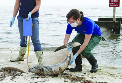 自上月20日起,英國(guó)石油公司清污人員、巡邏員、警官和一些居民在美國(guó)密西西比州格爾夫波特至阿拉巴馬州格爾夫肖爾斯大約210公里長(zhǎng)的海岸地帶總共發(fā)現(xiàn)20只幼年死海豚,其中大多發(fā)現(xiàn)于上周。美國(guó)格爾夫波特海洋哺乳動(dòng)物研究所負(fù)責(zé)人莫比·索蘭吉22日告訴路透社記者,今年發(fā)現(xiàn)的幼年死海豚數(shù)量尤其多。一般情況下,墨西哥灣每年春季吸引大約2000只至5000只海豚前來(lái)繁殖后代。按索蘭吉說(shuō)法,一些死海豚體長(zhǎng)不足1米,推斷是出生后隨即死亡或在母體內(nèi)流產(chǎn)而死。