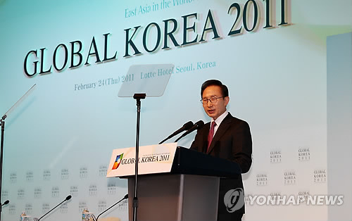 李明博24日出席在首爾樂天酒店舉行的“第三屆世界韓國國際學(xué)術(shù)會議”,并發(fā)表講話。(韓聯(lián)社)