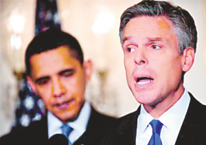 美駐華大使洪博培(右),被視為將在2012年總統(tǒng)競選中挑戰(zhàn)奧巴馬的共和黨人。