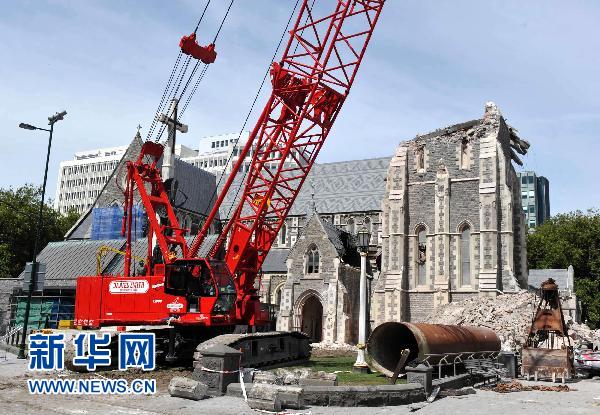 這是2月28日在新西蘭克賴斯特徹奇市拍攝的在地震中遭到嚴(yán)重?fù)p毀的一座有著百年歷史的大教堂。新西蘭警方28日說,克賴斯特徹奇地震遇難者人數(shù)已上升至148人。救援人員仍在不遺余力地搜尋失蹤者,今后的工作中心將逐步轉(zhuǎn)為幫助災(zāi)民恢復(fù)正常生活和災(zāi)后重建。新華社記者李秋嬋攝